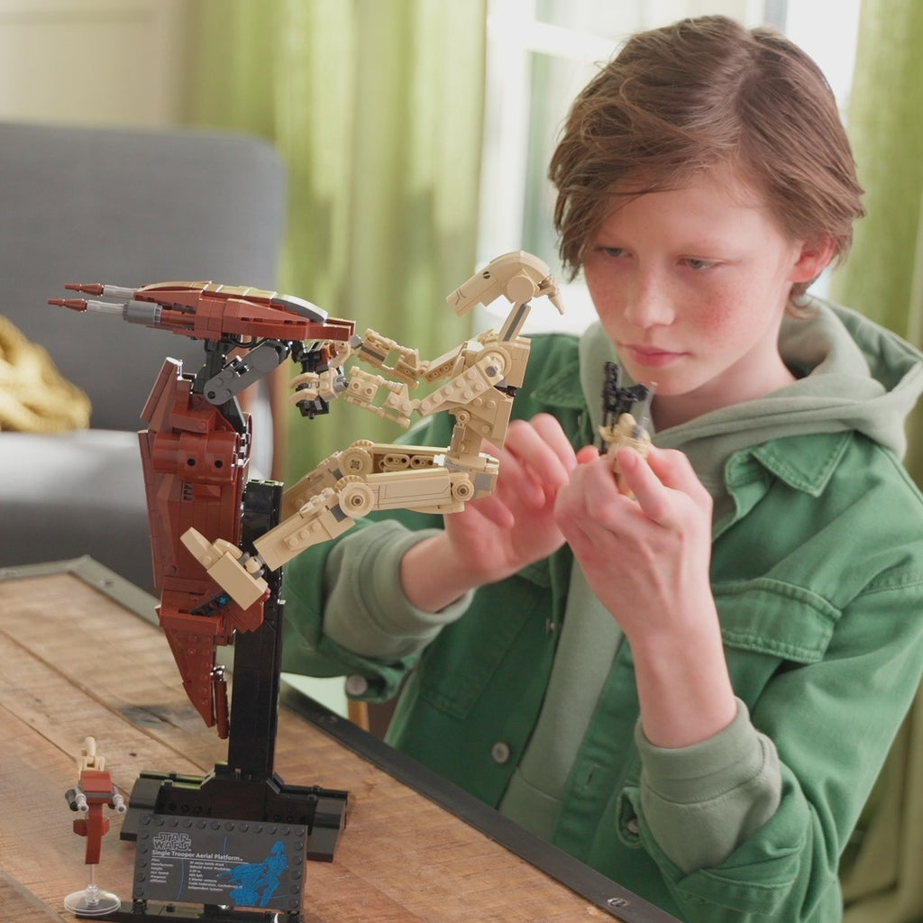 - Divertida decoración de escritorio: El soporte de exposición incorpora una placa informativa y cuenta con espacio para la figura LEGO® incluida del droide de combate con su speeder STAP
