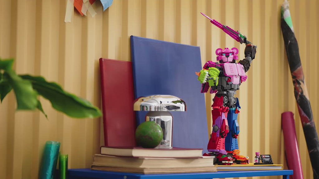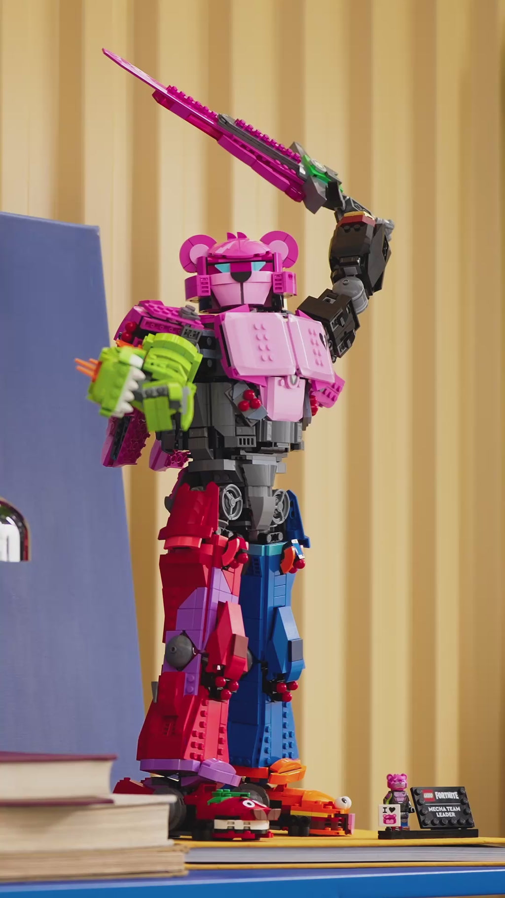 Sumérgete en un proyecto que te permite dar forma a la figura del meca del videojuego, basada en un emblemático personaje robótico que salvó la isla de Battle Royale de Fortnite en el Capítulo 1, antes de descubrir las múltiples posibilidades de exponerla. Puedes crear poses moviendo las caderas, brazos, pies y cabeza, y trae una espada de juguete. También hay una minifigura basada en el mismo personaje que se coloca en la cabina del pecho de la figura para pilotarla.