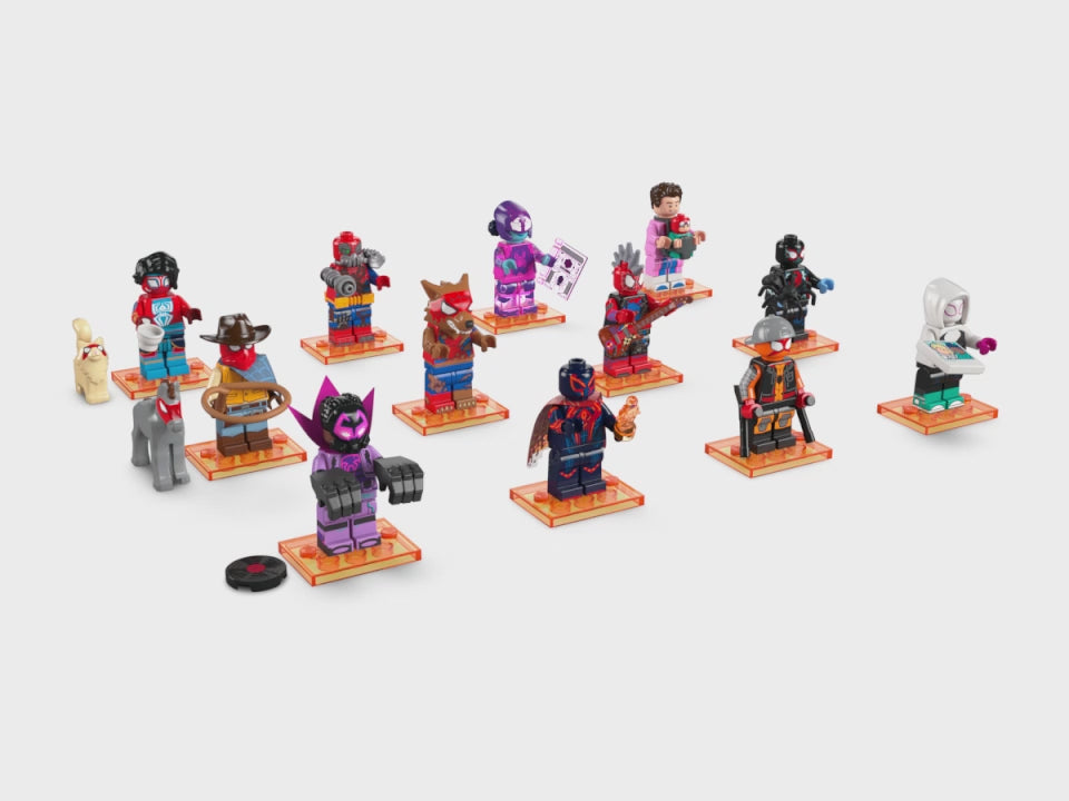 Hay 1 minifigura de juguete de Spider-Man para construir en cada caja y un total de 12 para coleccionar: Miles Morales/Spider-Man, Miguel O’Hara/Spider-Man 2099, Gwen Stacy/Spider-Gwen, Hobie Brown/Spider-Punk, Pavitr Prabhakar/Spider-Man India, Miles G. Morales/Prowler, Peter B. Parker/Spider-Man y May “Mayday” Parker, Margo Kess/Spider-Byte, Peter Parker/Werewolf Spider-Man, Patrick O’Hara/Web-Slinger, Petra Parker/Cyborg Spider-Woman y Charlotte Webber/Sun-Spider.