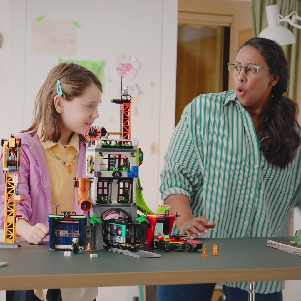 - ¿Qué contiene la caja? Modelos como la Torre City, una grúa de juguete, un tren de metro, una nave espacial y vehículos de policía y bomberos, además de 7 minifiguras, entre ellas 5 personajes de la serie para televisión LEGO® City: Sin límites